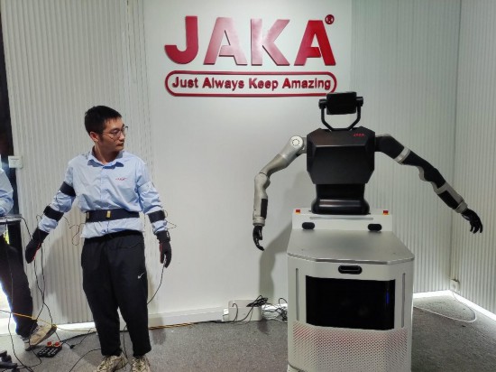 节卡机器人公司工作人员展示用动作控制机器人。黄晓慧摄